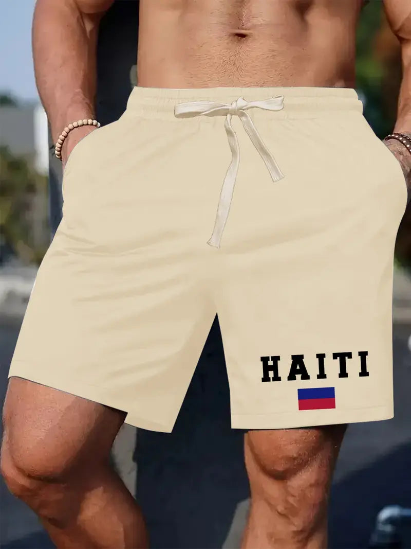 Men'S casual shorts with "HAITI" Print - Light Gray, Elastic Waistband with Drawstring, Polyester Fabric, Regular Fit, Casual Style for Summer, Summer Casual Wear | Letter Print Shorts | Flexible Waistband. (Apricot) GX1814939 T