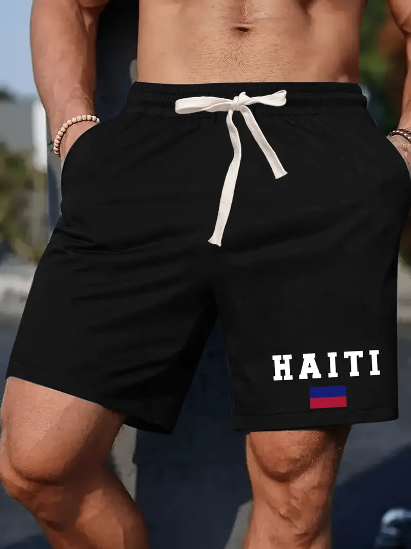 Men'S casual shorts with "HAITI" Print - Light Gray, Elastic Waistband with Drawstring, Polyester Fabric, Regular Fit, Casual Style for Summer, Summer Casual Wear | Letter Print Shorts | Flexible Waistband. (Black) GX1814939 T