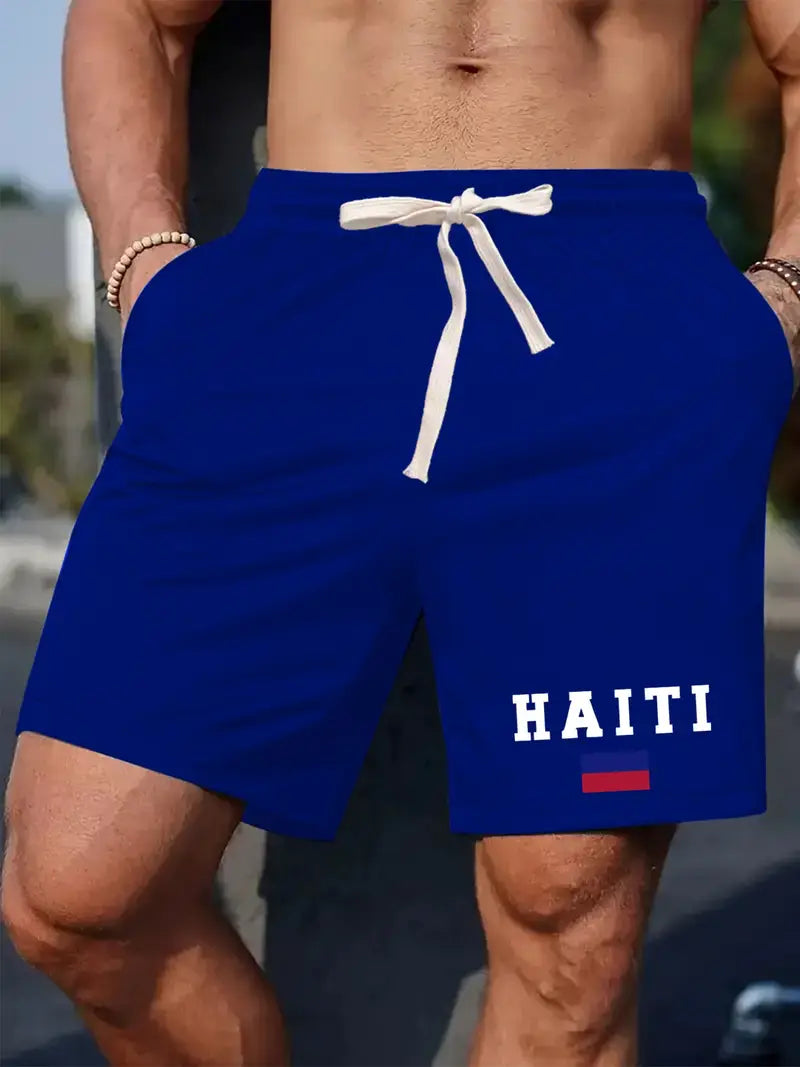 Men'S casual shorts with "HAITI" Print , Elastic Waistband with Drawstring, Polyester Fabric, Regular Fit, Casual Style for Summer, Summer Casual Wear | Letter Print Shorts | Flexible Waistband. (Blue) GX1814939 T