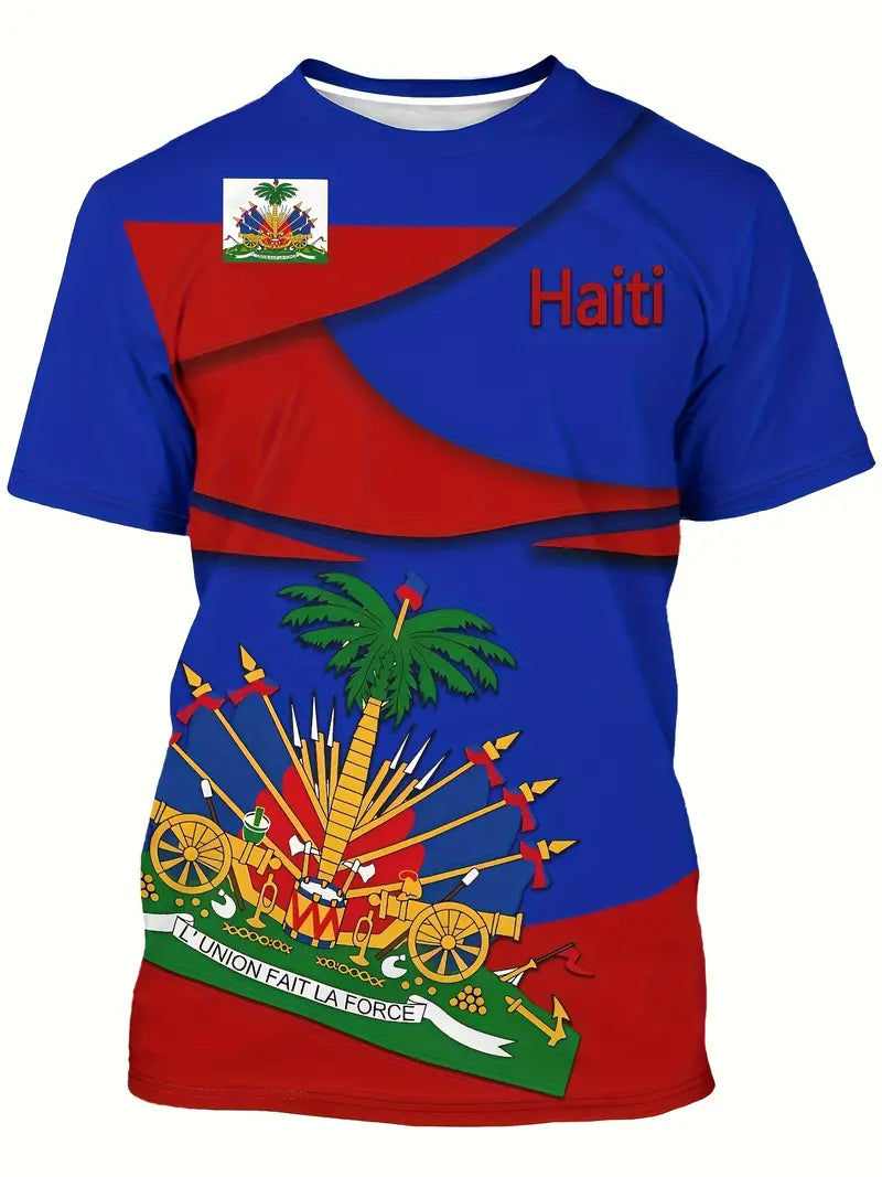 Men's Haitian National Flag & Emblem Print T-Shirt - Breathable Polyester, Slightly Elastic Round Neck, Regular Fit Casual Summer Top for Casual Attire, Haitian T Shirt, Cultural Pride Apparel, Vibrant Colors, Lightweight Knit,. FJ2787764 T