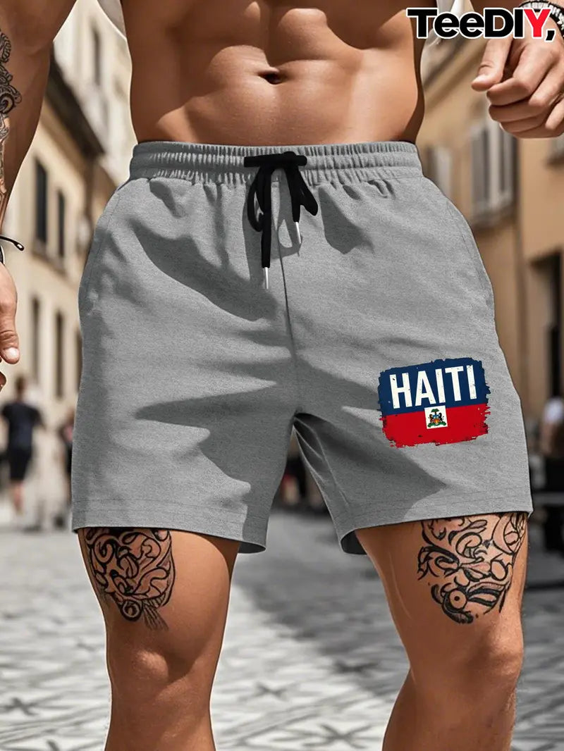 Men's Casual Shorts with Haiti Flag Distressed Letters & Geometric Pattern - Elastic Waist Drawstring, Breathable Fabric, Machine Washable, Regular Fit for Casual Attire, Comfortable Swimwear, Medium Elasticity, Lounge Wear. (Light Grey) RT3748403