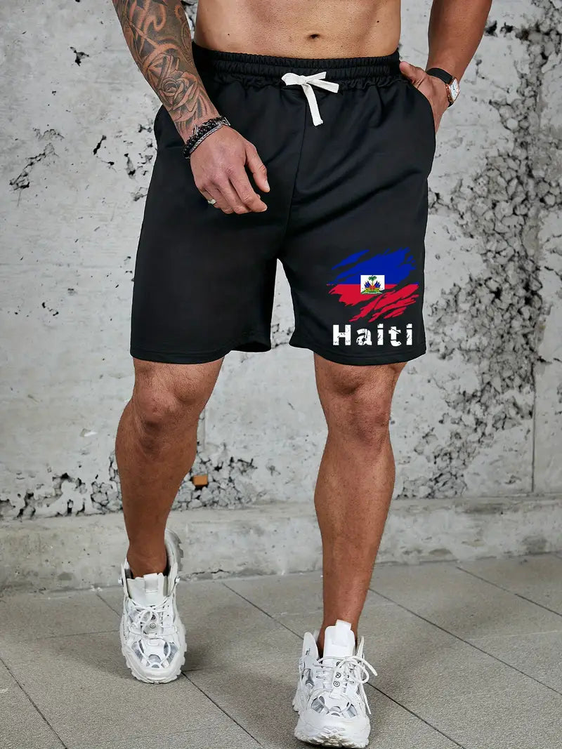 Men's Summer Casual Shorts with Haiti Flag Print - Breathable Polyester Knit Drawstring Waist Athletic Shorts for Fitness, Cycling, Climbing - Lightweight with Pockets. CJ1675662 T