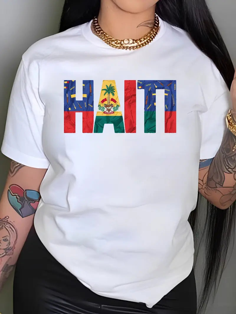 Women'S Casual Cotton T-Shirt with Haitian Flag Alphabet Print, Crew Neck, Short Sleeve, Regular Length - Spring/Summer Collection. JG504616 T